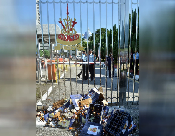 tindakan memecahkan botol minuman keras di pintu pagar utama bangunan