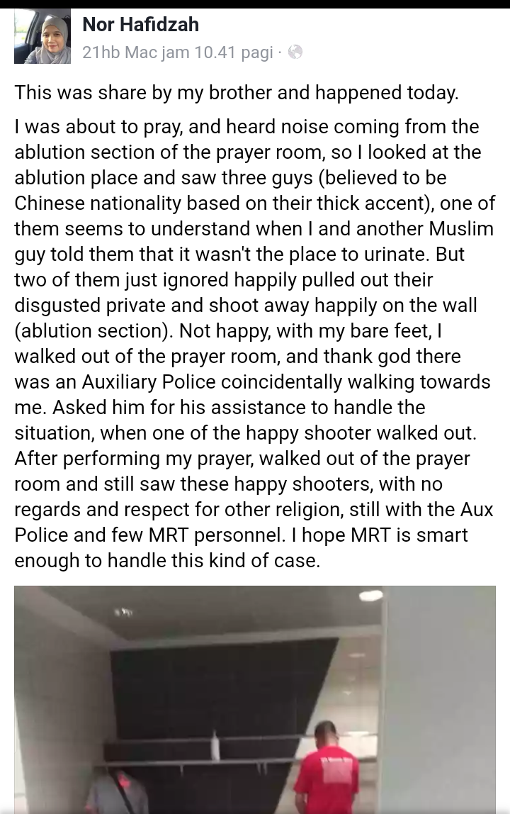“Setelah selesai solat, saya keluar daripada surau itu dan ternampak mereka yang selamba kencing itu, tanpa peduli dan hormat agama lain, masih lagi bersama dengan Polis Bantuan tersebut dan dengan beberapa petugas MRT.”