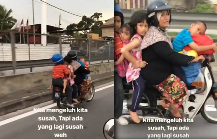 Seorang daripada anaknya terlentok di bakul hadapan motosikal, manakala tiga beradik lagi saling memegang erat antara satu sama lain dengan anak yang paling kecil berada di tengah-tengah.