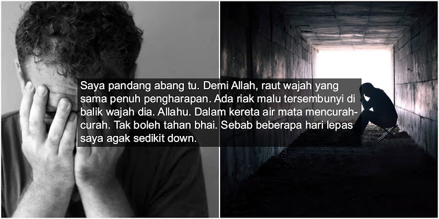Saya pandang abang tu. Demi Allah, raut wajah yang sama penuh pengharapan. Ada riak malu tersembunyi di balik wajah dia. Allahu. Saya tak tahu apa masalah abang ini dan saya juga tidak mahu bertanya apa-apa.