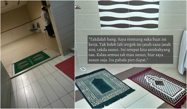 Tujuan dia susun tu hanyalah disebabkan dia tak nak tempat tu berselerak. Malah yang lebih mengagumkan, dia susun sebab dia hormat dengan sejadah yang menjadi tempat sujud pengguna surau tu.