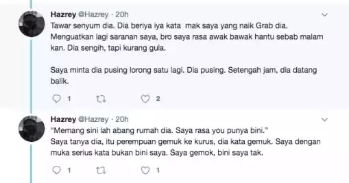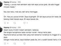 Seorang netizen Hazrey tampil berkongsi di laman twitternya kisah seorang pemandu Grab yang baik hati. Lelaki ini sanggup mencari semula rumah penumpangnya semata-mata mahu memulangkan barangan dapur yang tertinggal dalam bonet keretanya.