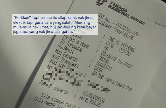 Maka bill pun turun lah dr RM400 lebih ke seratus lebih. Lebih kurang sebulan lalu.. Pihak tnb datang utk buat pemeriksaan meter dan mereka kata “penggunaan elektrik tidak relevan”. Gitu lah lebih kurang.. So bila mereka dapat tau ada penjimatan.. Mereka terus kluarkan surat saman..