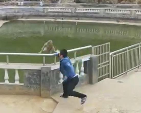 Monyet tersebut mengejarnya dan mencakar seluruh muka dan tangan lelaki itu. Kejadian terbabit dirakamkan di kuil Xitian, China.