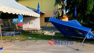 KANOPI dan bahan kempen yang dirosakkan oleh pihak tidak bertanggungjawab. FOTO Abdnor Hamizam