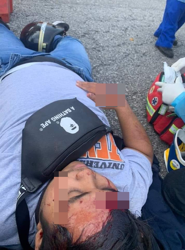 Berdasarkan gambar, penunggang motosikal mengalami kecederaan di bahagian tangan dan kepala. Tidak diketahui bagaimana keadaan pemandu Avanza terbabit.