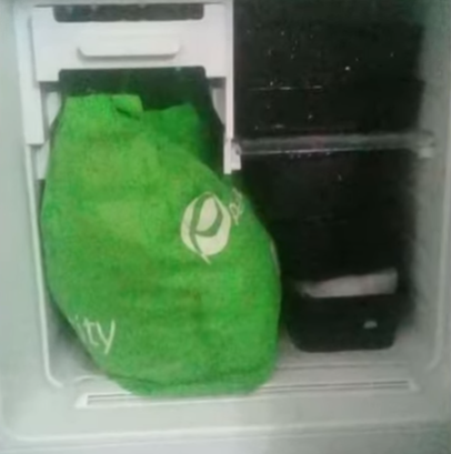 Seterusnya Nor Aqilah masuk ke dalam rumah dan menunjukkan arah satu peti ais jenama Samsung berpintu dua, dan dibuka di bahagian sejuk beku kelihatan satu beg kain Pandan City Go Green.