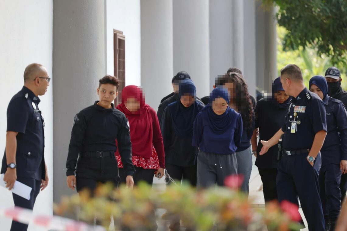 Pengasas eHATI (kanan, bertudung) antara enam individu yang dibawa ke mahkamah untuk permohonan reman. FOTO: FARIZ RUSADIO