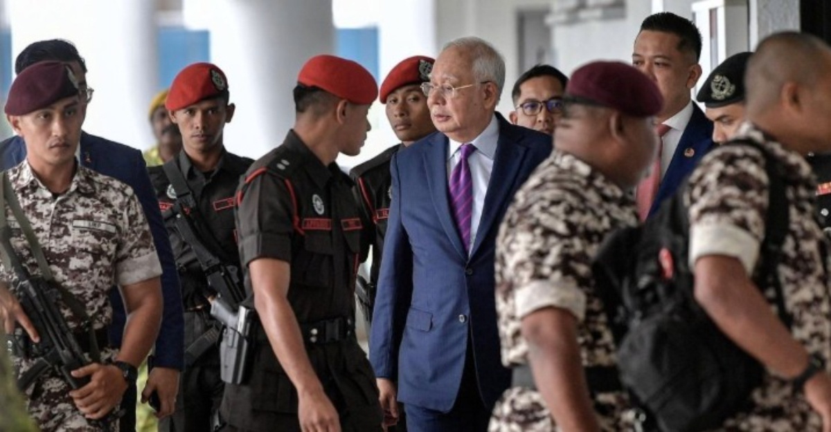 Najib yang mengenakan sut biru, kelihatan tenang sepanjang prosiding. Turut hadir ialah ahli keluarga dan penyokongnya.